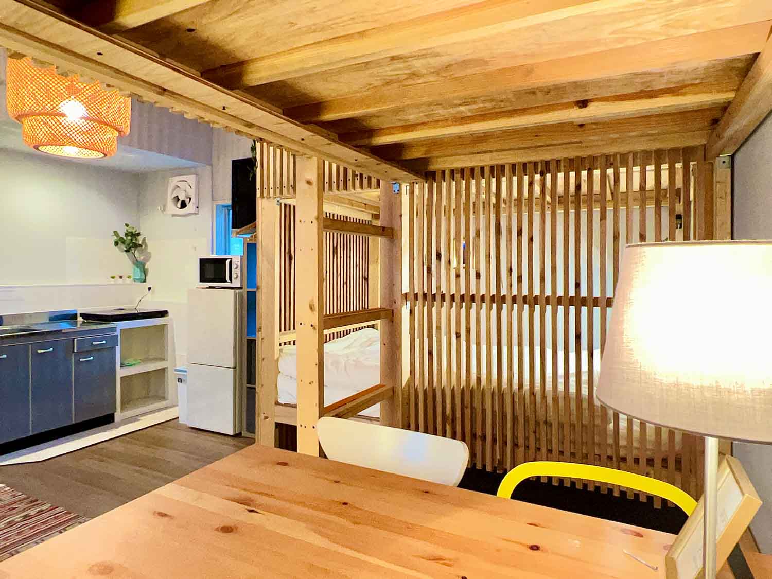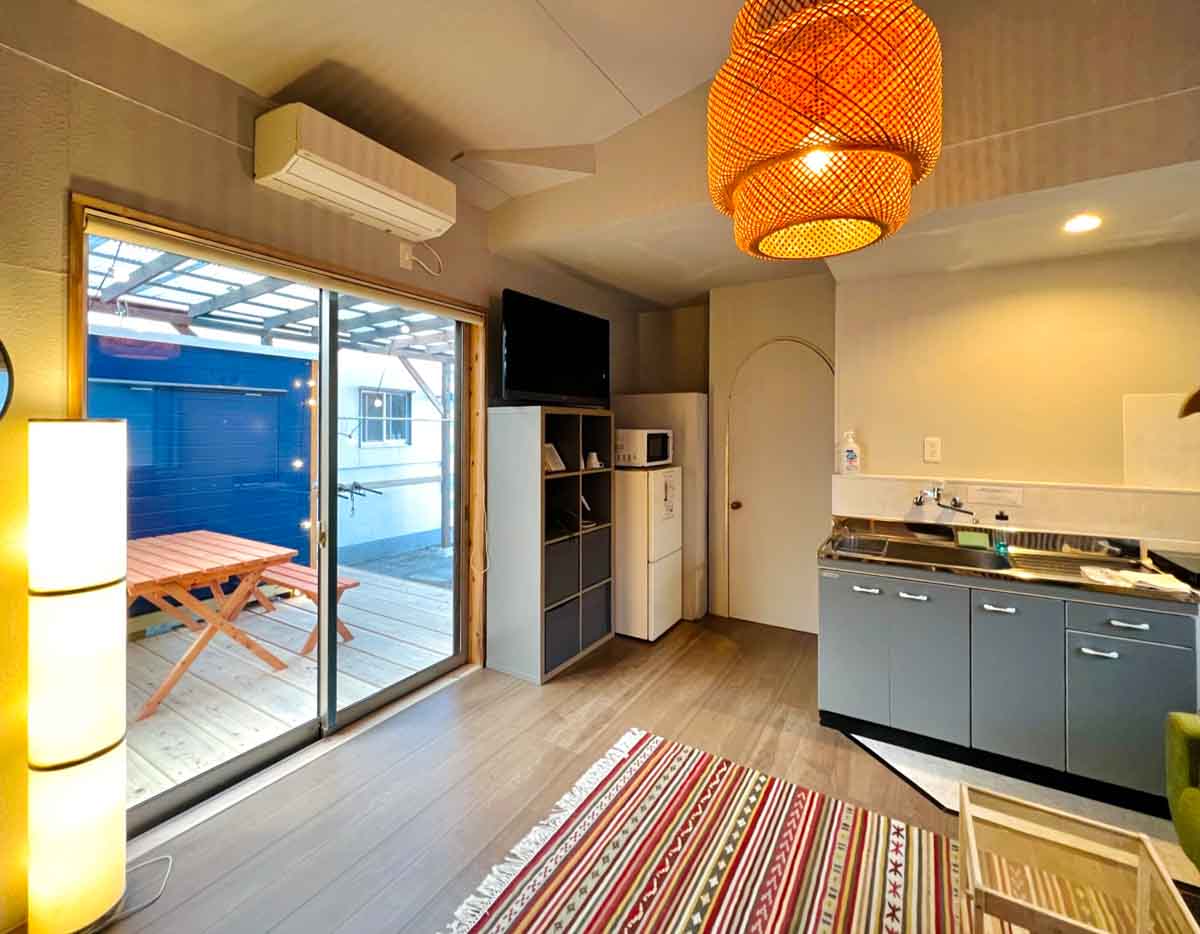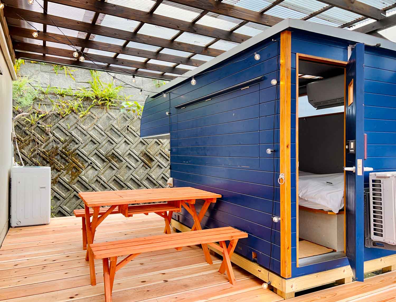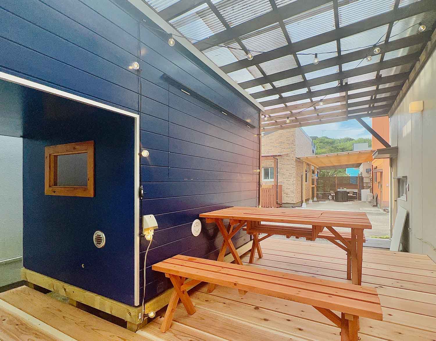 サーフキャンプ103は、一軒家とタイニーハウス(離れ)という二つの部屋があります。また母家と離れの間には、デッキスペースがあり、バーベキューもできます(BBQセット有料貸出可能)。コンパクトでありながら異なる2つの空間を使って、時には外のデッキスペースで、バーの様にワイワイと、時には静かにチルな音楽でもかけながらゆっくりと、いろんな楽しみかたのある、おもしろ一棟。一軒家なので、隣を気にせず家族やグループでの宿泊に最適です。またキッチン・洗濯機もあるので、長期滞在にも最適です。外用シャワー、サーフボード置き場も完備。ウェットスーツも外で洗えます。NETFLIX見たい放題(民放は映りません)。1人用サウナ付き