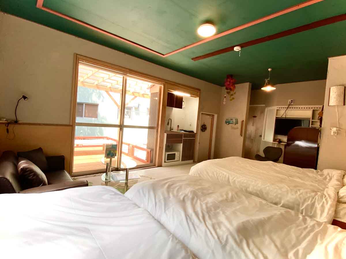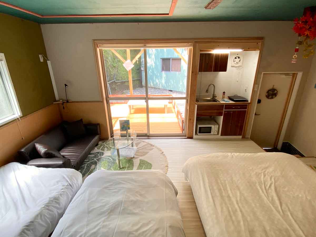 ウッドデッキからは額縁から見るような緑がみえ、独立した一軒家で、他のお客様と接する機会は無いですが、気になる方は気になると思います。