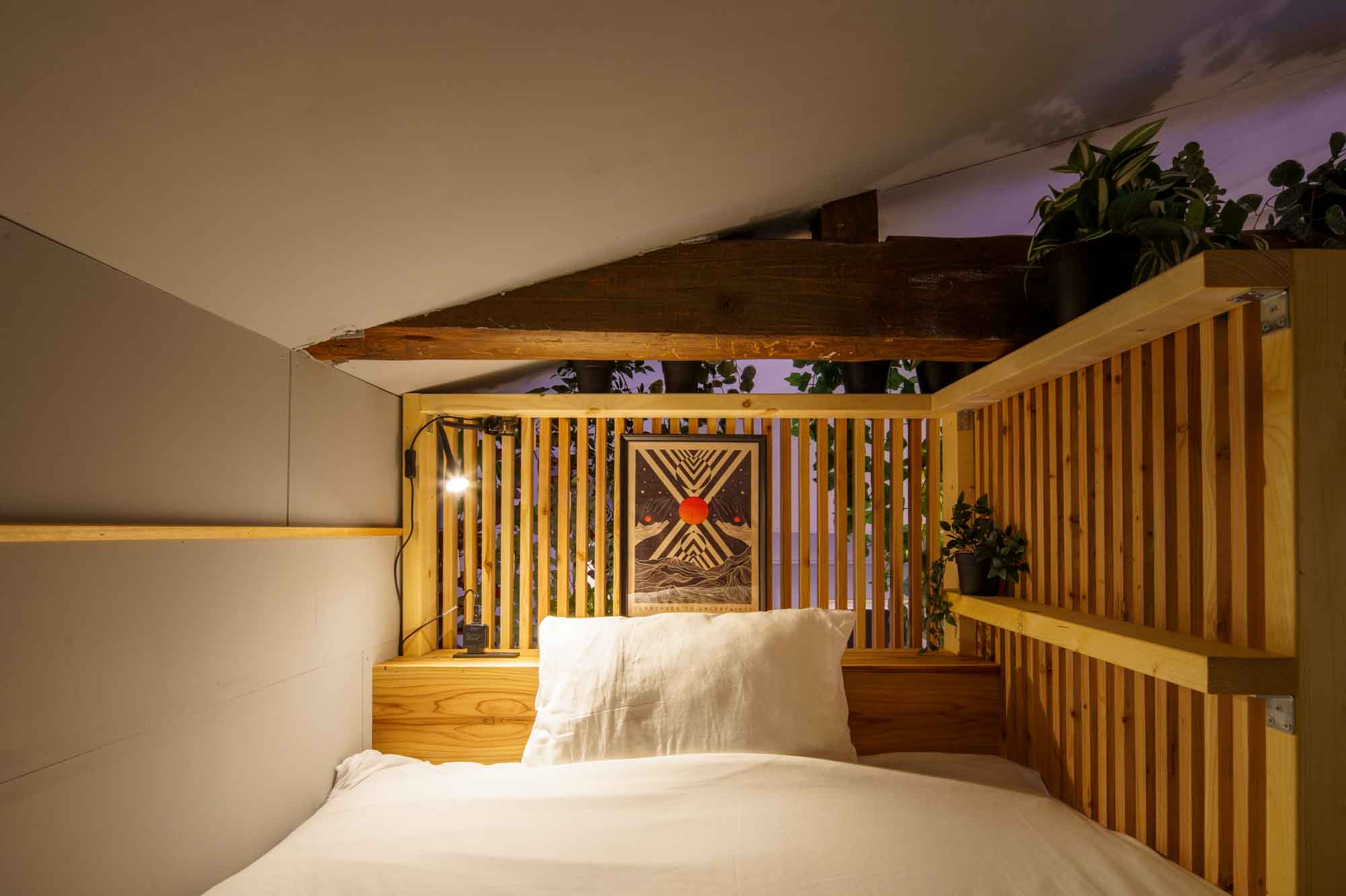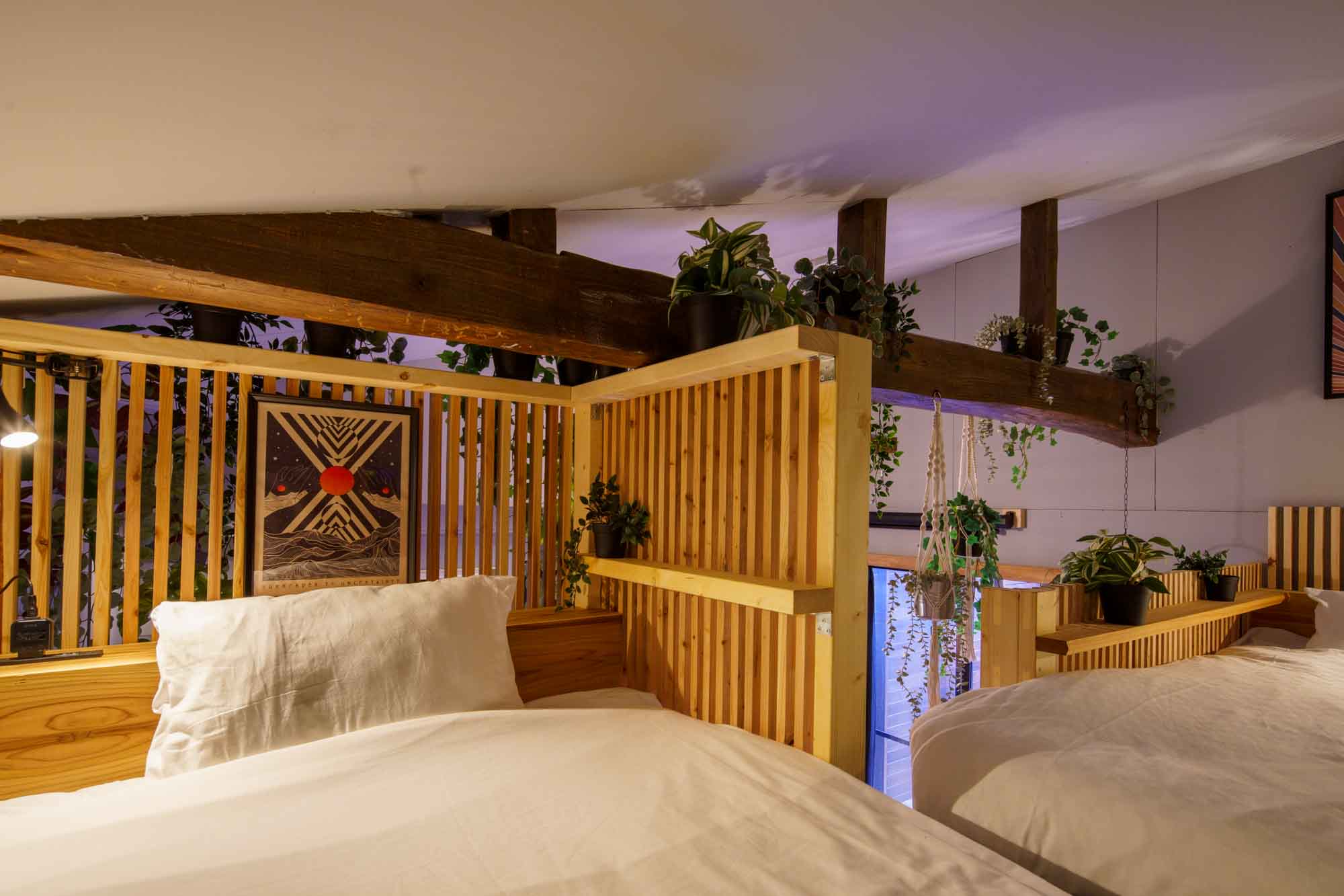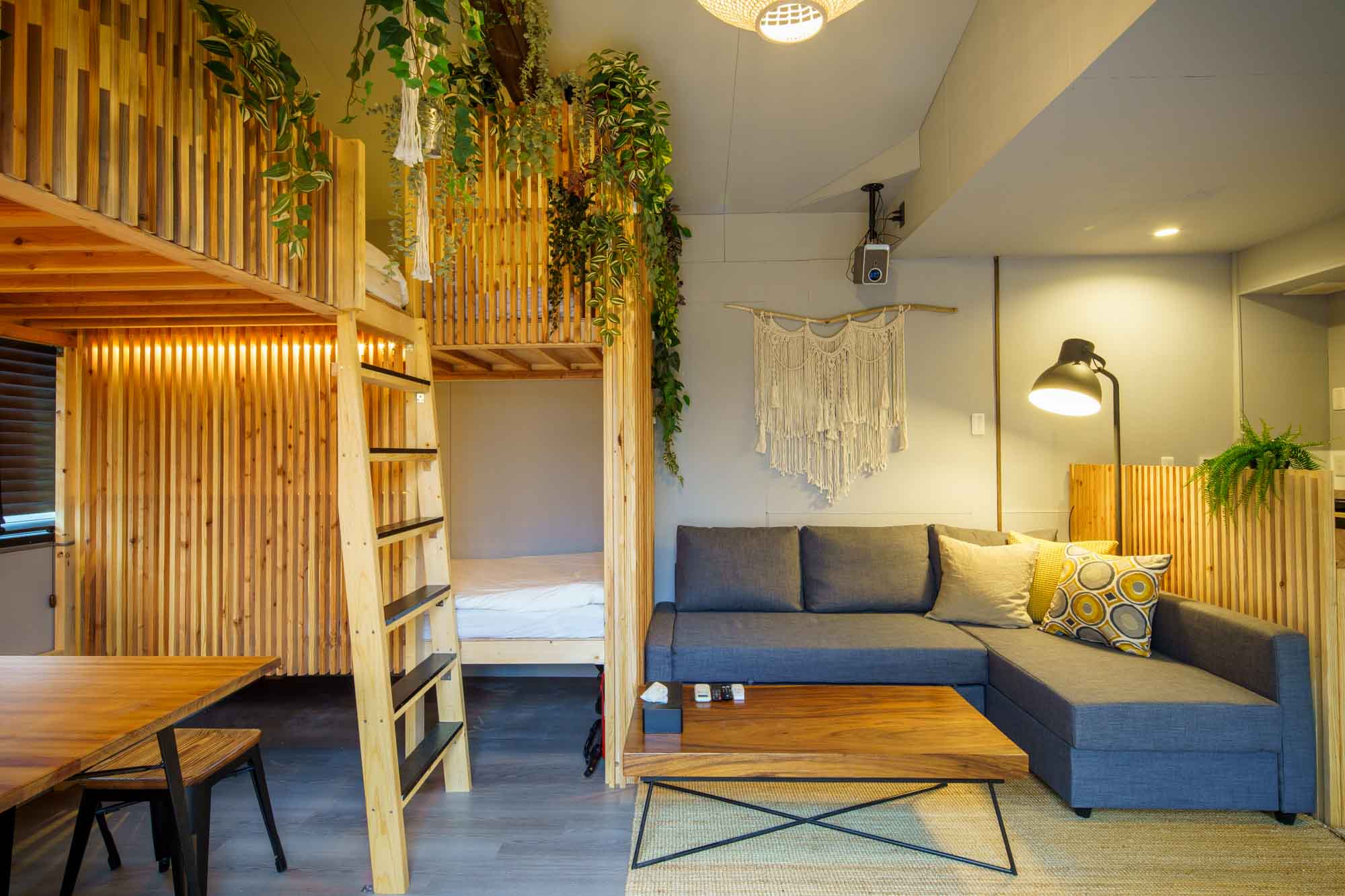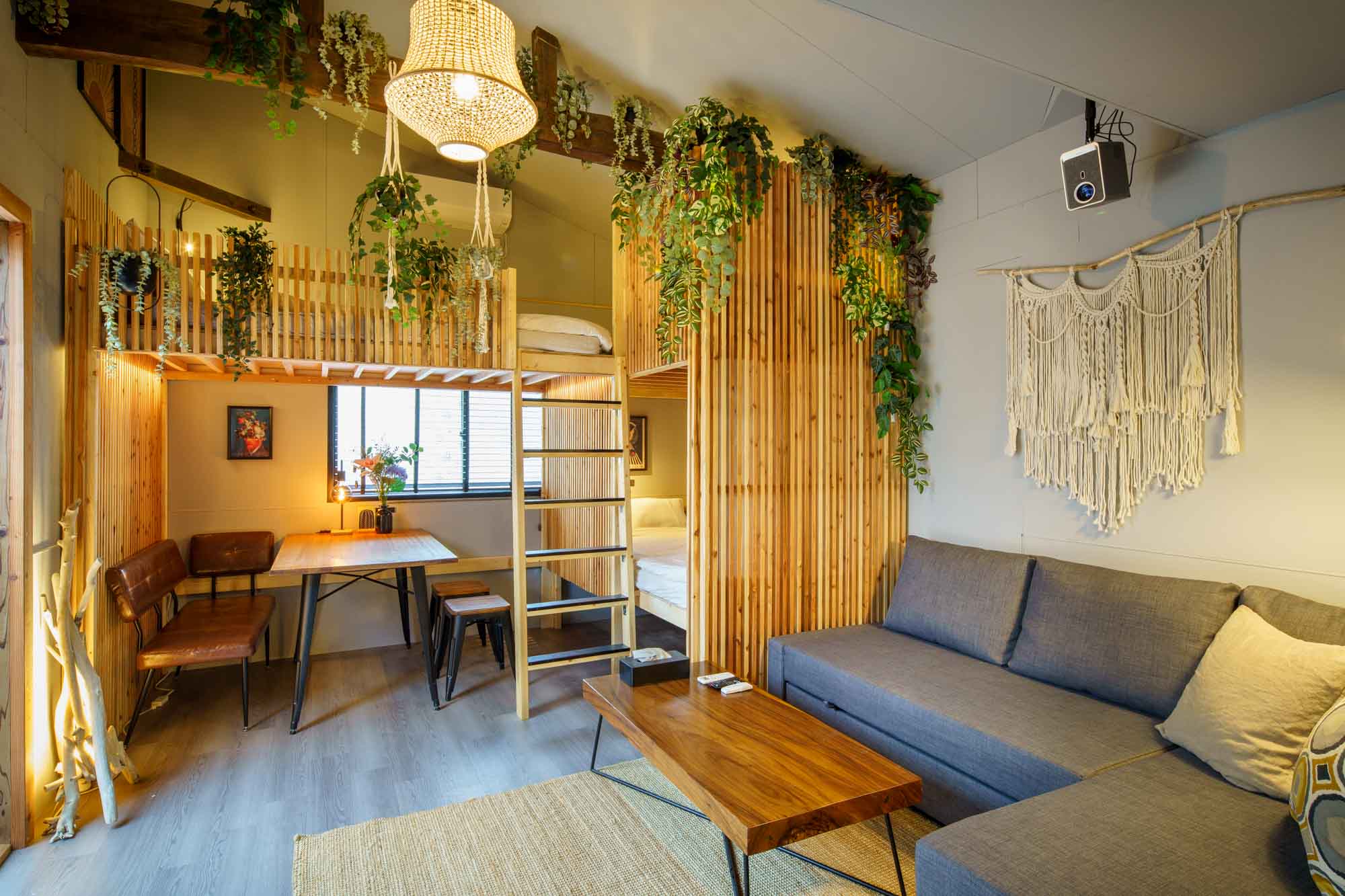 サーフキャンプ108は、大きなテラスと、キッチン、リビング、ダイニングがある広々物件。ロフトの寝室にはダブルベッドとセミダブルベッドがあり、リビングにはセミダブルベッドがあります。テラスにはソファーもあるので、内と外でかなり広々、さまざまな使い方ができます。ファミリーでも子供がロフトで、大人がリビングのベッドに泊まれ、友達同士でもプライバシーも保ちつつ、短期でも長期でも過ごせます。もちろんサーファーの皆さんにも使いやすいように入り口にはサーフボードラックや、テラスにはシャワー、水道も完備、ウェットスーツも外で洗えます。また、駐車スペースでは、バーベキューもできます(BBQセット有料貸出可能)。コンパクトでありながら異なる2つの空間を使って、時には外のテラスで、バーの様にワイワイと、時には静かにチルな音楽でもかけながらゆっくりと、またリビングには100インチのプロジェクターがあるので、大画面で映画も見れます。