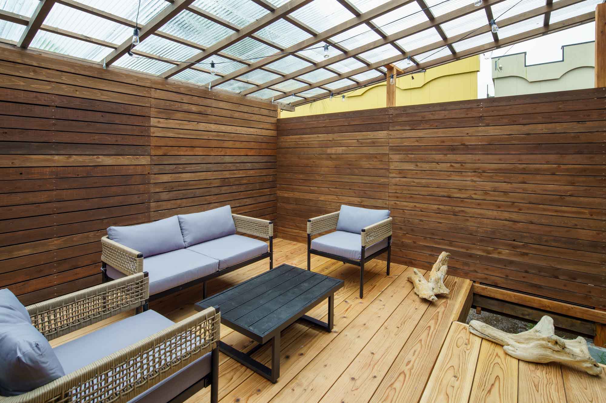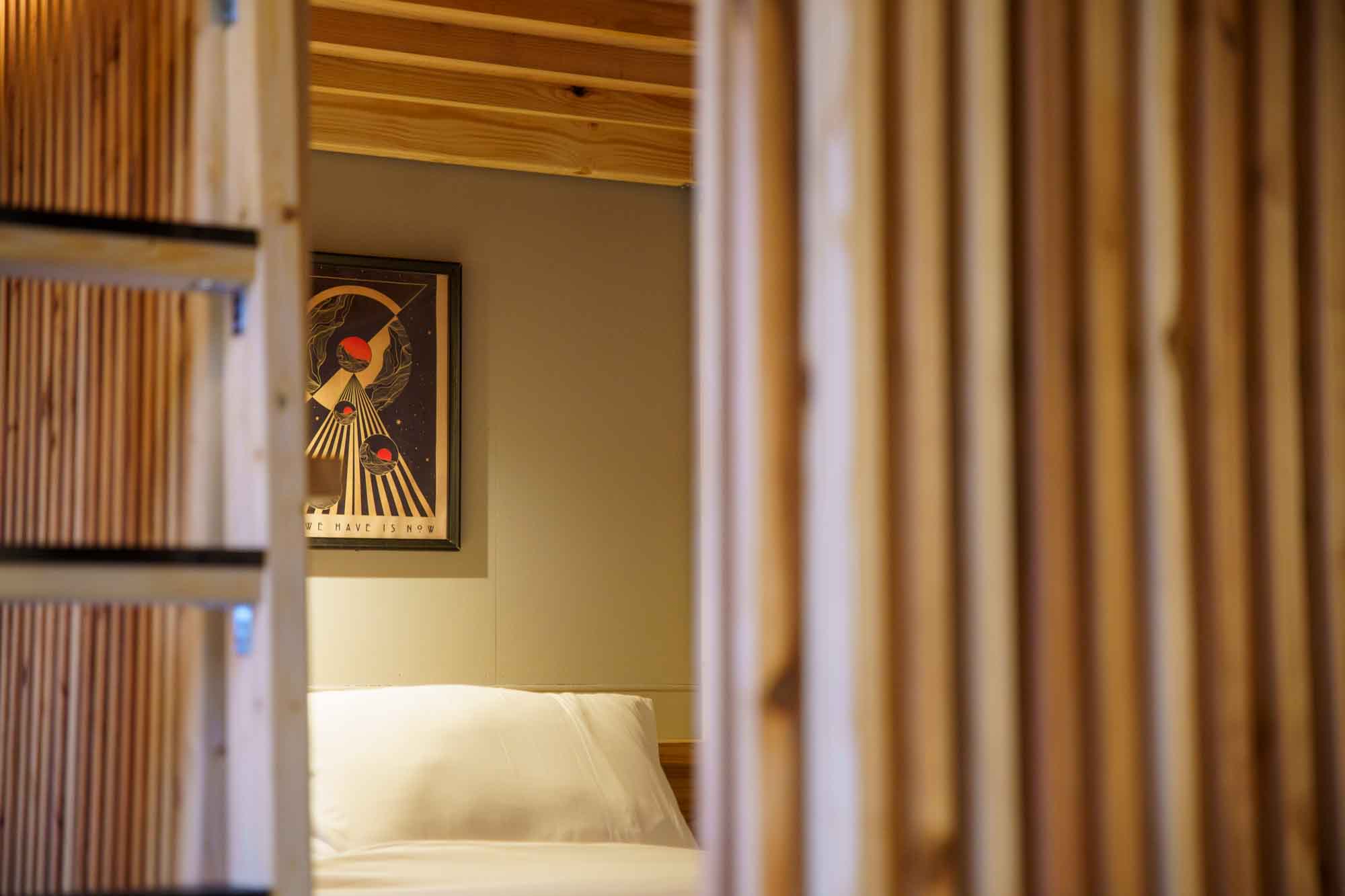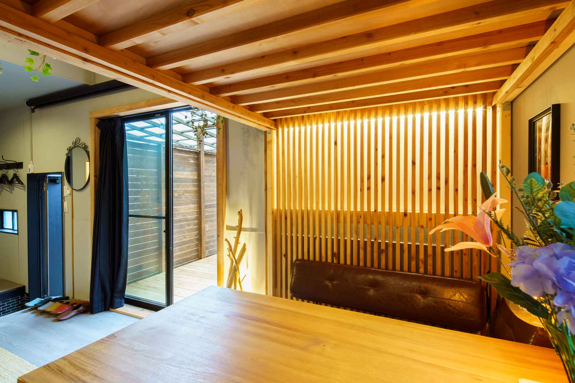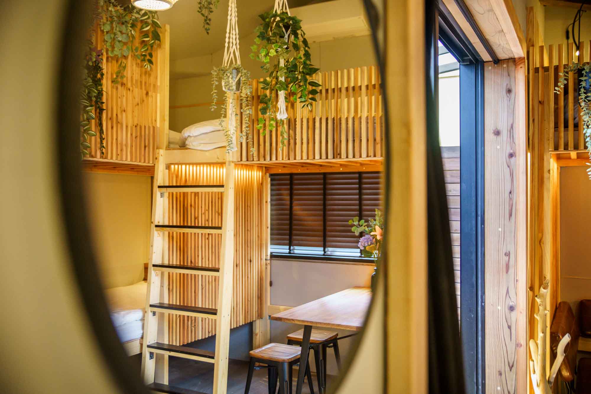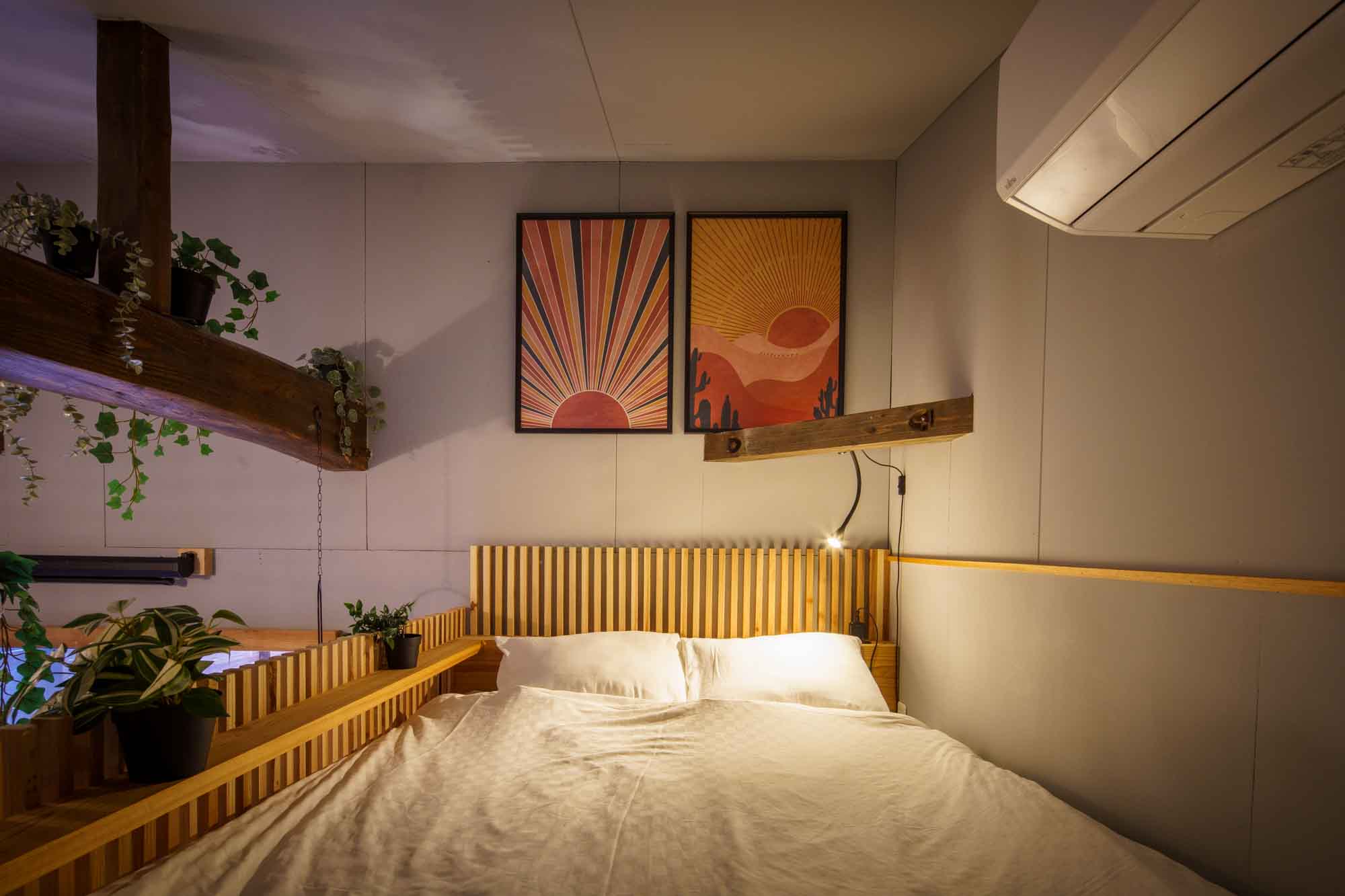 サーフキャンプ108は、大きなテラスと、キッチン、リビング、ダイニングがある広々物件。ロフトの寝室にはダブルベッドとセミダブルベッドがあり、リビングにはセミダブルベッドがあります。テラスにはソファーもあるので、内と外でかなり広々、さまざまな使い方ができます。ファミリーでも子供がロフトで、大人がリビングのベッドに泊まれ、友達同士でもプライバシーも保ちつつ、短期でも長期でも過ごせます。もちろんサーファーの皆さんにも使いやすいように入り口にはサーフボードラックや、テラスにはシャワー、水道も完備、ウェットスーツも外で洗えます。また、駐車スペースでは、バーベキューもできます(BBQセット有料貸出可能)。コンパクトでありながら異なる2つの空間を使って、時には外のテラスで、バーの様にワイワイと、時には静かにチルな音楽でもかけながらゆっくりと、またリビングには100インチのプロジェクターがあるので、大画面で映画も見れます。