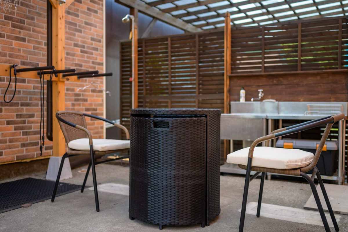 ◉ サーフスタンド、外用シャワー、洗濯機、物干し、ホース付き蛇口が完備。サーフトリップに是非どうぞ!
