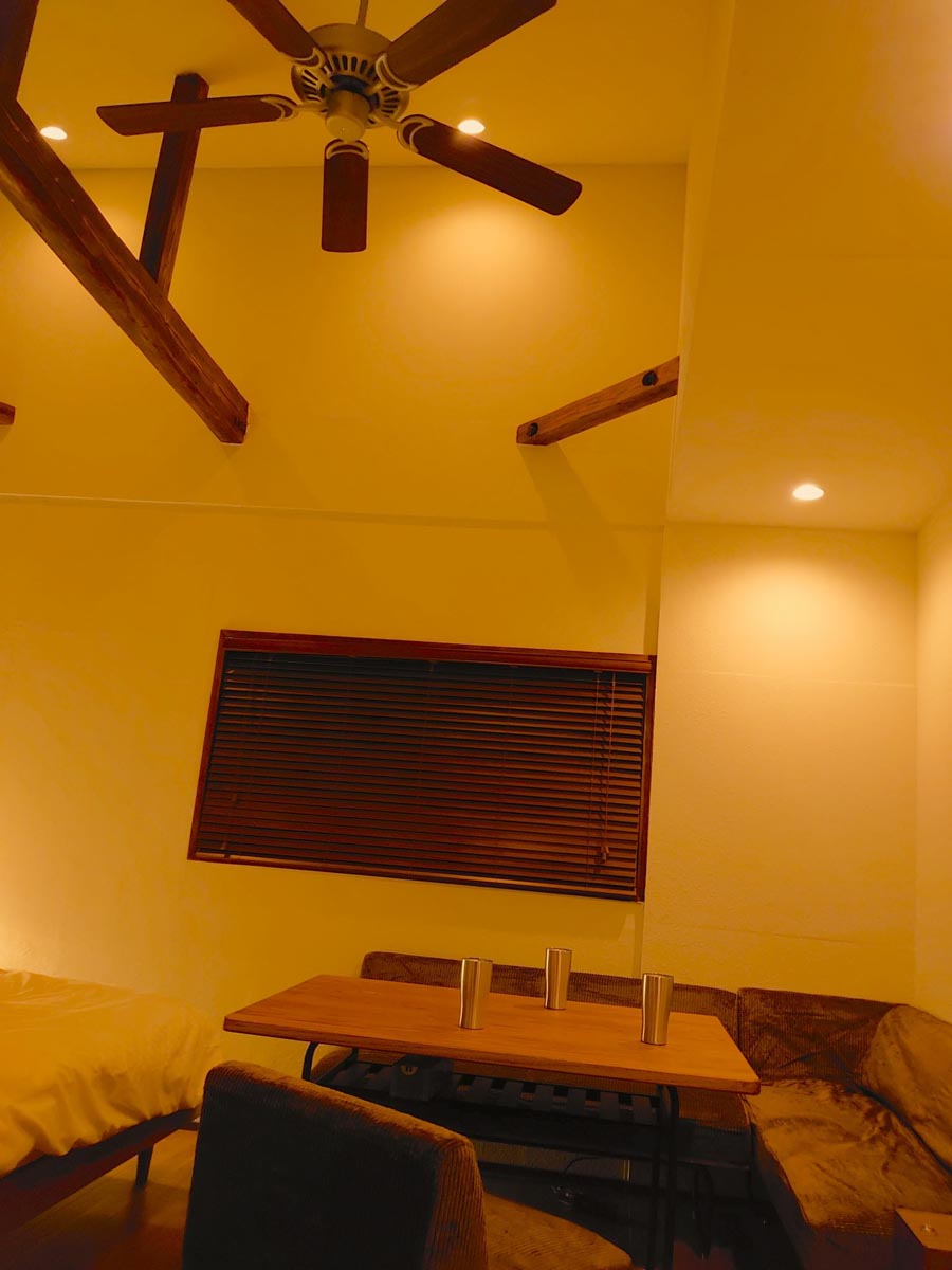 ◉明るめの電球色から夕日の色まで変化する調光ライトを設置しました。お好みの雰囲気でお過ごし下さい。
