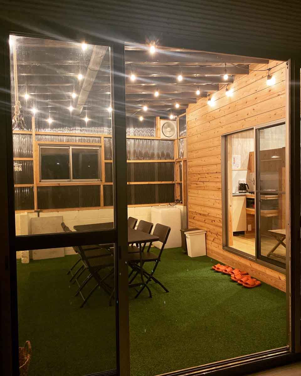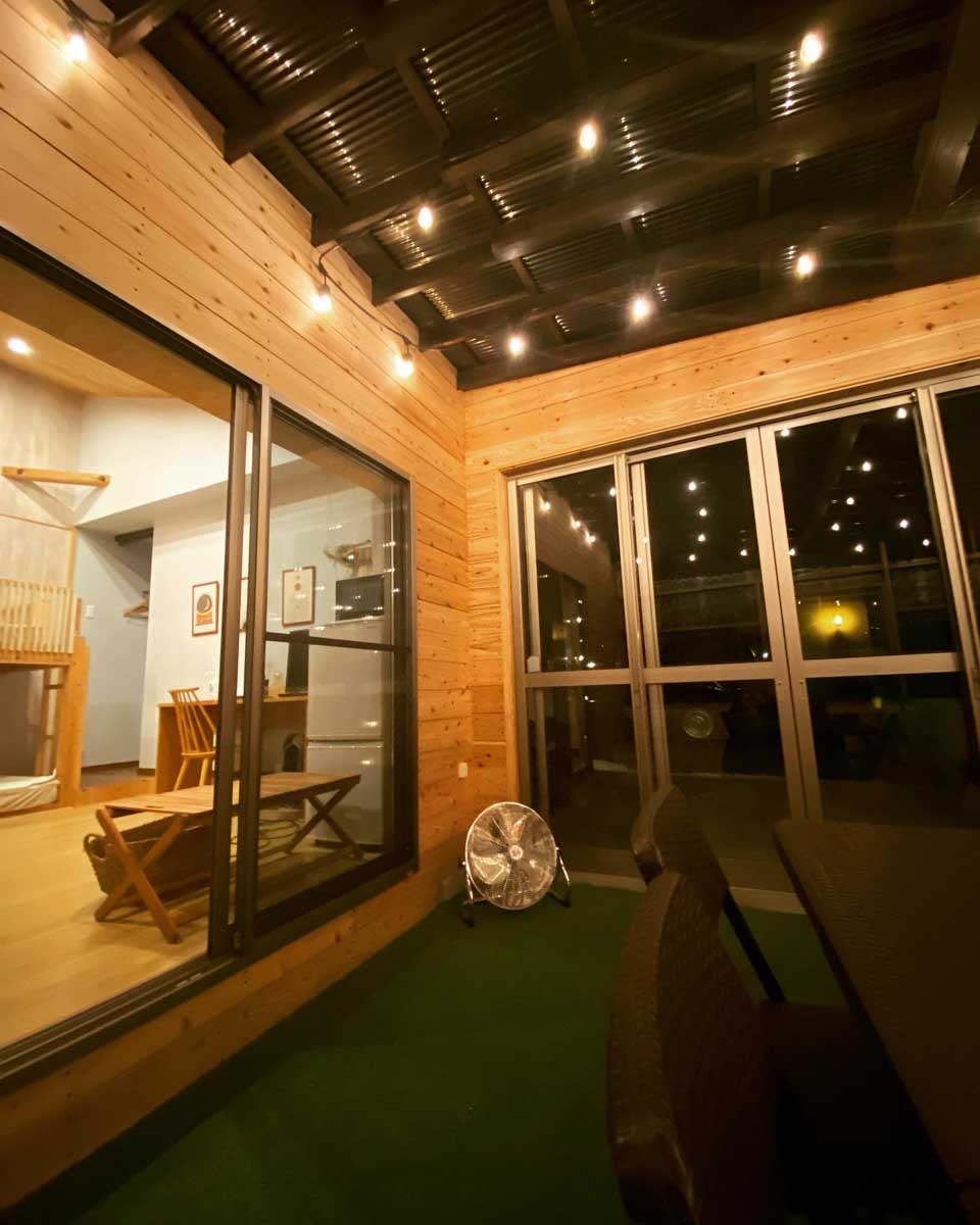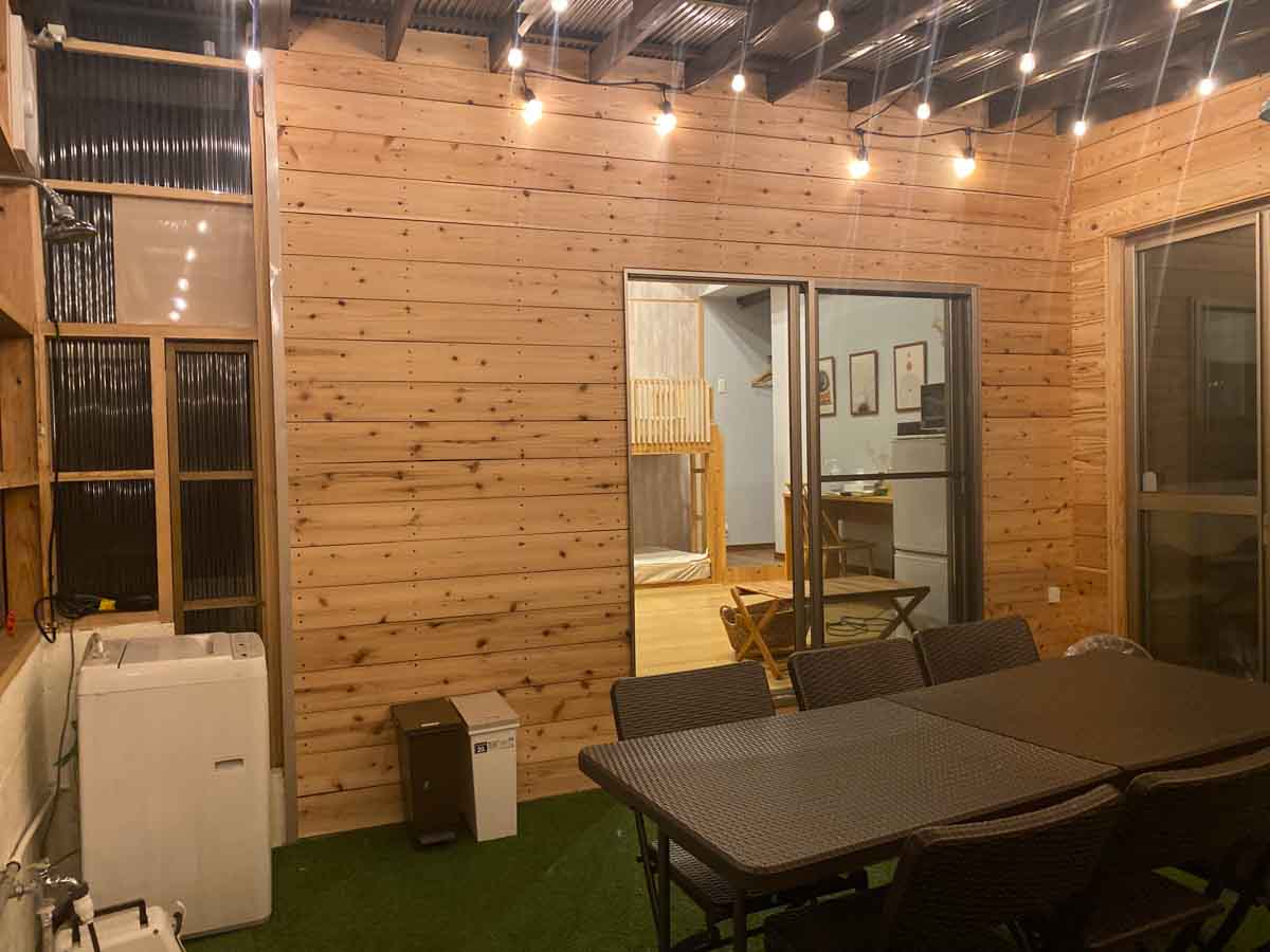 テラスにはストリングライトと外シャワーを設けており、夜もお洒落な雰囲気でBBQ等が楽しめます。