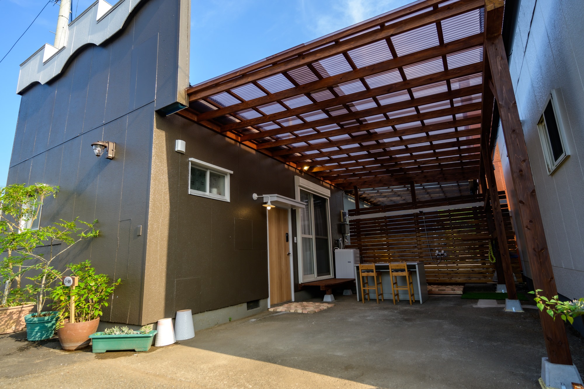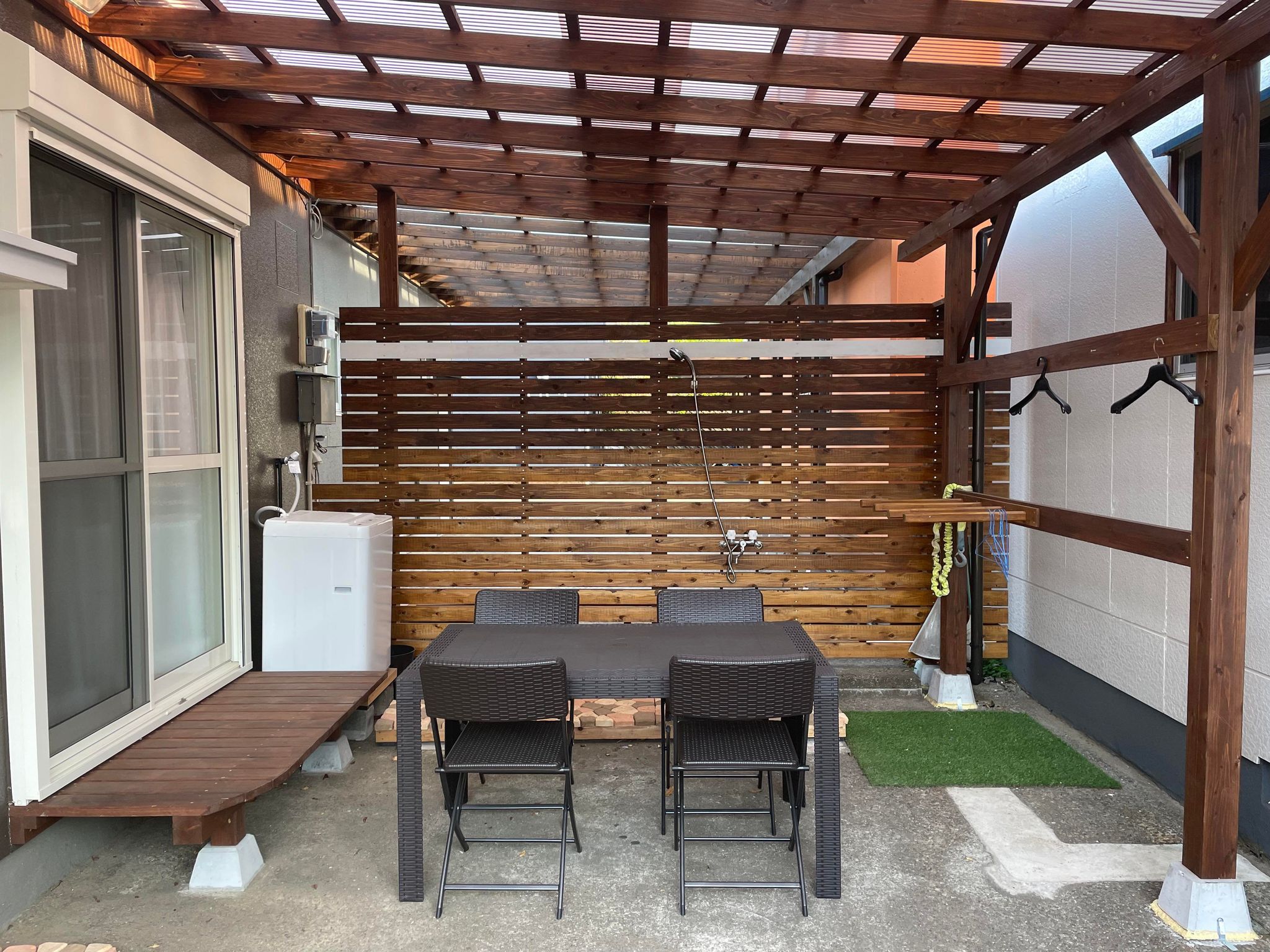 一棟貸しで外には屋根付きフェンス付きのオープンテラス!小さなお子様連れやワンちゃんとまわりを気にする事なくバーベキューを楽しむ事ができます。